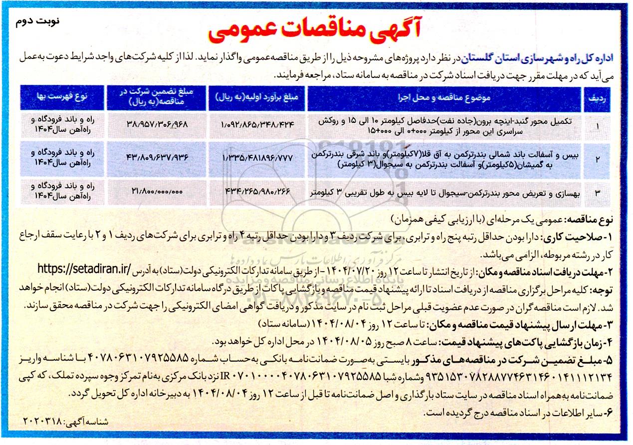 اداره کل راه و شهرسازی استان گلستان در نظر دارد پروژه های مشروحه ذیل را از طریق مناقصه عمومی واگذار نماید. لذا از کلیه شرکتهای واجد شرایط دعوت به عمل می آید که در مهلت مقرر جهت دریافت اسناد شرکت در مناقصه به سامانه ستاد مراجعه فرمایند.