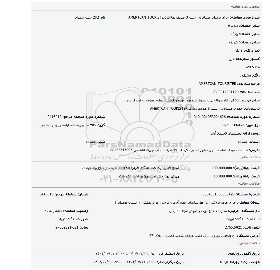 مزایده عمومی مزایده چمدان مسافرتی ست 3 عددی بمارک AMERTCAN TOURISTER برگزار میگردد. از کلیه افراد متخصص و شرکت‌های واجد شرایط دعوت به عمل می‌آید تا در این مزایده با کد خبرگزاری پارس نماد : 9676841 شرکت نمایند تاریخ شروع مزایده : 1404/07/19 مهلت شرکت در مزایده: تا پایان روز 1404/07/21 مکان برگزاری اموال واگذاری استان‌های همدان و دسته‌بندی‌های مربوط به این حراجی متفرقه میباشد.
