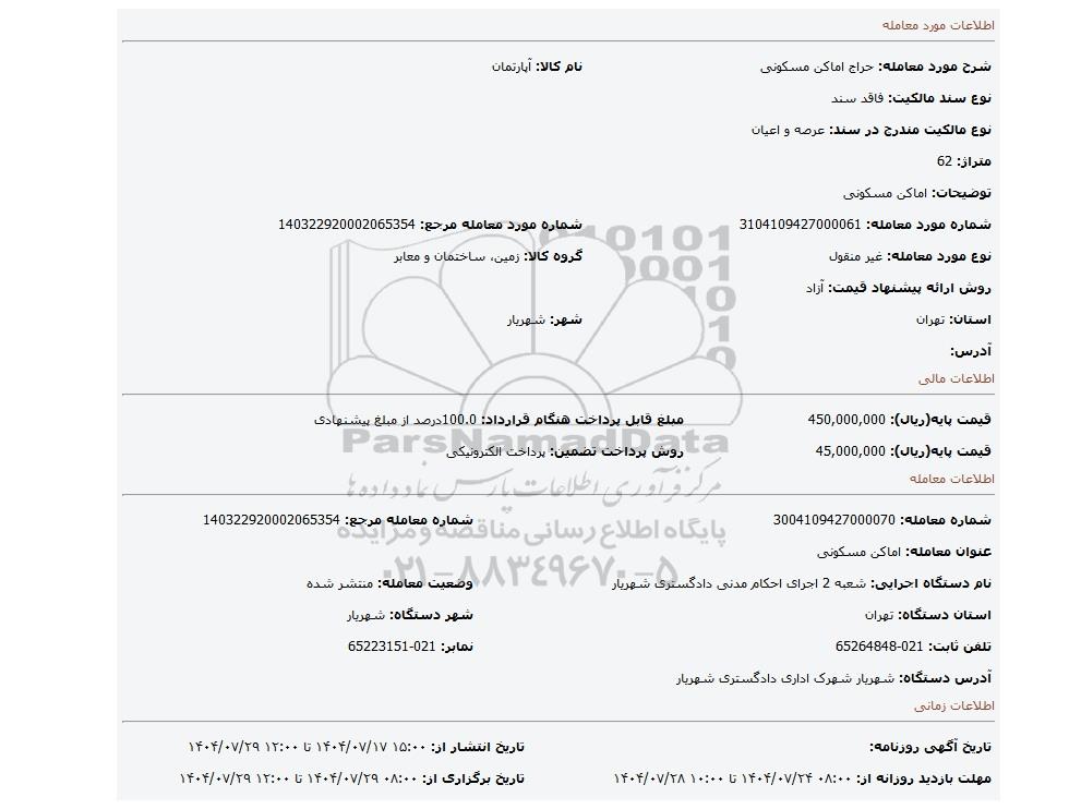 شرح مورد معامله: حراج اماکن مسکونینام کالا: آپارتمان