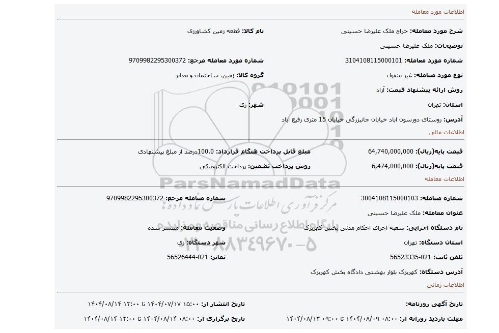 شرح مورد معامله: حراج ملک علیرضا حسینینام کالا: قطعه زمین کشاورزی