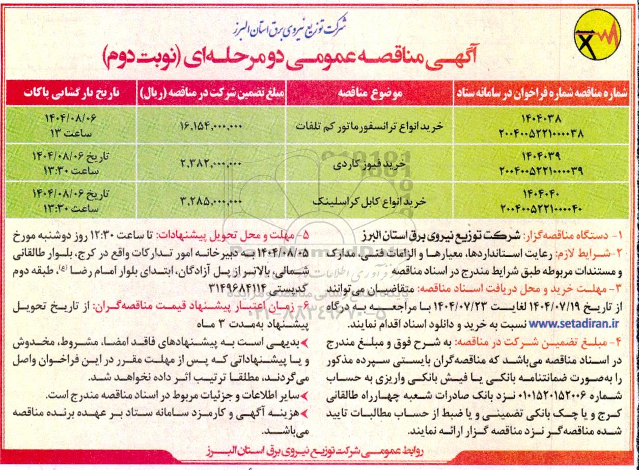 1. دستگاه مناقصه گزار : شرکت توزیع نیروی برق استان البرز
