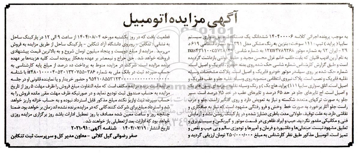 به موجب پرونده اجرائی کلاسه 140400006 ششدانگ یک دستگاه اتومبیل سواری سیستم سایپا (پراید) تیپ : 111 سوخت بنزین به رنگ مشکی مدل 1391 به شماره انتظامی 619 د 39 - ایران 92 به شماره موتور 1374789268 به شماره شاسی nas43110025728139 به نام آرین ادیب قلیان که بابت طلب خانم غزل محسن مجید و حقوق دولتی بازداشت گردیده است و طبق گزارش کارشناس شماره شاسی حک شده روی بدنه خودرو ، فابریک و اصیل است. شماره حک شده بر روی سیلندر موتور خودرو فابریک و اصیل است. پلاکت مشخصات وسیله نقلیه فابریک و نصب است. پلاک نیروی انتظامی منصوبه روی وسیله نقلیه جلو و عقب فابریک و اصیل است. اتاق سواری سایپا (111) پراید هاچ بک) و رنگ وسیله نقلیه سورمه ای بدون فابریک و اصیل است. اج تایرهای جلو در حد 65 درصد و تایرهای عقب در حد 75 درصد است . سپر جلو به صورت ترکهای متعدد شکسته و نیاز به تعویض دارد و روی گلگیر راست جلو و درب راست جلو آثار برخورد به صورت خط وخش و فرو رفتگی مشهود است که نیاز به صافکاری و نقاشی دارد به علت توقیف طولانی مدت باطری دشارژ شده و در پارکینگ روشن نشد و آزمایش فنی و مکانیکی مقدور نگردید عیب و ایراد ظاهری در قسمت موتور و گیربکس و سیستم برق و تعلیق مشهود نیست. صندلیها و داشبورد و فرمان و آمپرها و تودوزی سالم و بی عیب و نقص و تمیز است. اتومبیل مذکور طبق نظر کارشناس به مبلغ 250.000.000 تومان ارزیابی گردید و قطعیت یافت که در روز یکشنبه مورخه 1404.08.04 از ساعت 9 الی 12 در پارکینگ ساحل به نشانی : تنکابن - روبروی دانشگاه آزاد تنکابن - پارکینگ ساحل از طریق مزایده به فروش می رسد . مزایده از مبلغ دویست و پنجاه میلیون تومان شروع و به بالاترین قیمت پیشنهادی فروخته خواهد شد. حق حراج و نیمعشر بر عهده بدهکار پرونده است کلیه هزینه ها بر عهده برنده مزایده است شرکت در مزایده منوط به پرداخت ده درصد از مبلغ پایه کارشناسی به حساب سپرده ثبت در بانک ملی به شماره 12480100004053013207550386 با شناسه 954108553123000000000000000000 و حضور خریدار و یا نماینده قانونی او در جلسه مزایده است برنده مزایده مکلف است که ما به التفاوت مبلغ فروش را ظرف مهلت 5 روز از تاریخ مزایده به حساب صندوق ثبت تودیع نماید و در صورتیکه ظرف مهلت مقرر مانده فروش را به حساب سپرده ثبت واریز نکند مبلغ مذکور قابل استرداد نبوده و به حساب خزانه واریز خواهد شد و استرداد مبلغ برای شرکت کنندگانی که در مزایده برنده نشده اند زمان بر خواهد بود. ضمنا چنانچه روز و ساعت معین شده مصادف با روز تعطیل ادارات باشد روز برگزاری مزایده روزی خواهد بود که ادارات بعد از تعطیلی باز خواهند شد.
