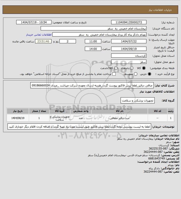 شرح کلی نیاز: صافی دیالیز_لطفا پیش فاکتور پیوست گردد_هزینه ارسال بعهده شرکت میباشد _عبدی 09186660024