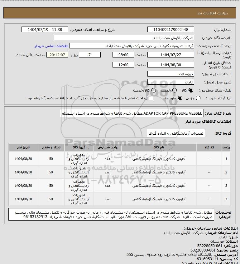 استعلام ADAPTOR CAP PRESSURE VESSEL.مطابق شرح تقاضا و شرایط مندرج در اسناد استعلام, استعلام ADAPTOR CAP PRESSURE VESSEL.مطابق شرح تقاضا و شرایط مندرج در اسناد استعلام