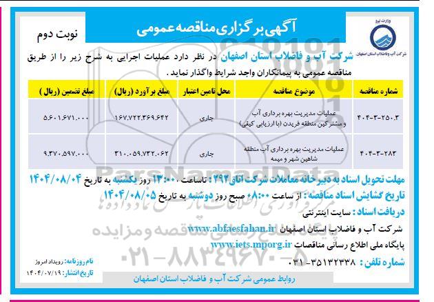 | 404-3-250.3 | عملیات مدیریت بهره برداری آب و مشترکین منطقه فریدن با ارزیابی کیفی | جاری | 167.722.369.642 | 5.601.671.000 |