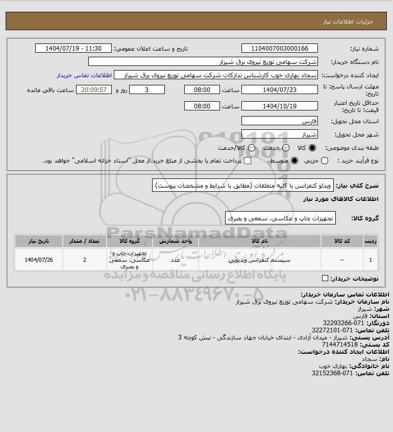 شرح کلی نیاز: ویدئو کنفرانس با کلیه متعلقات (مطابق با شرایط و مشخصات پیوست)
