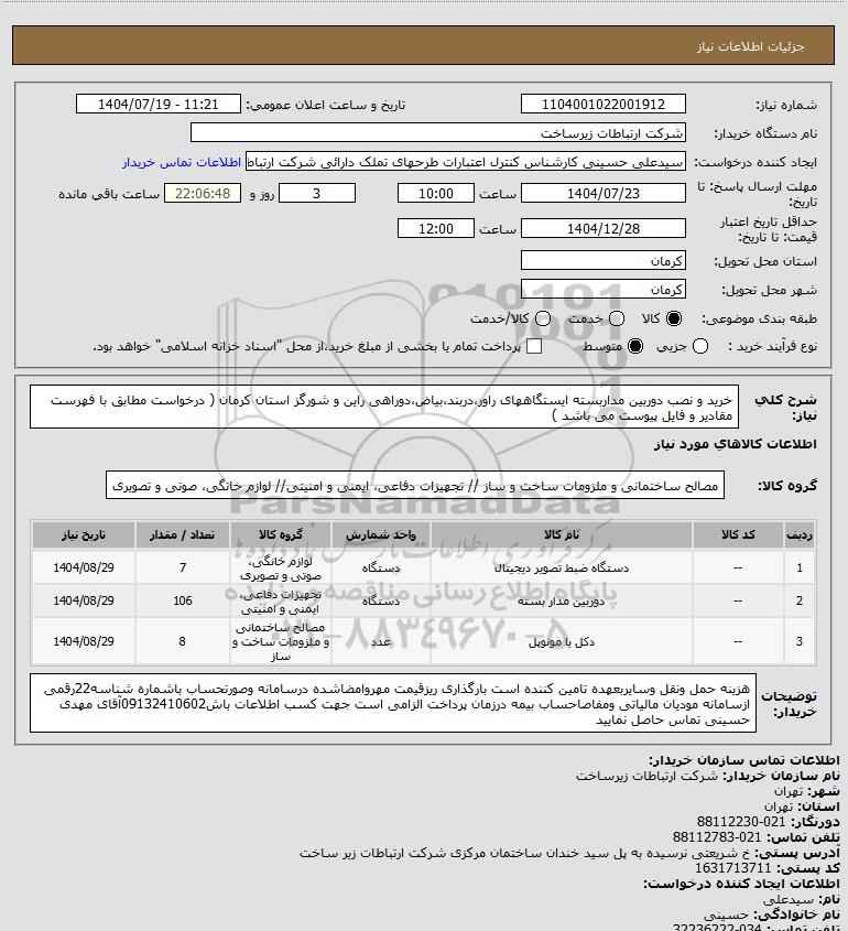 شرح کلی نیاز: خرید و نصب دوربین مداربسته ایستگاههای راور،دربند،بیاض،دوراهی راین و شورگز استان کرمان ( درخواست مطابق با فهرست مقادیر و فایل پیوست می باشد )