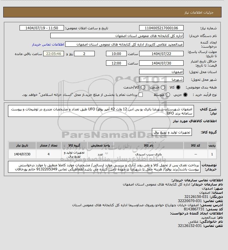 شرح کلی نیاز: اصفهان شهرستان شهرضا باتری یو پی اس 12 ولت 42 آمپر یوفو) UFO طبق تعداد و مشخصات مندرج در توضیحات و پیوست سامانه برند UFO