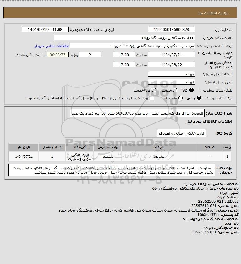 شرح کلی نیاز: تلویزیون ال ای دی هوشمند ایکس ویژن مدل 50XCU785 سایز 50 اینچ تعداد یک عدد