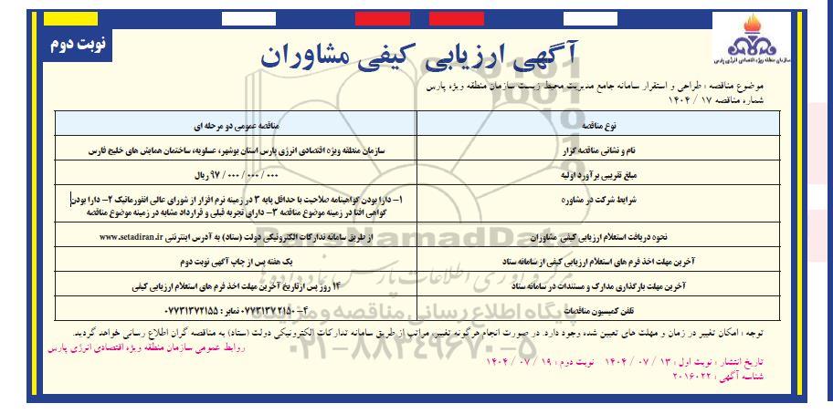 موضوع مناقصه: طراحی و استقرار سامانه جامع مدیریت محیط زیست سازمان منطقه ویژه پارس شماره مناقصه 1404/17
