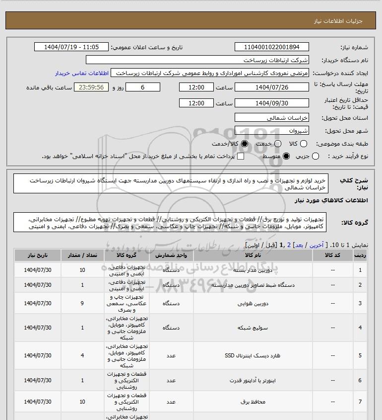 شرح کلی نیاز: خرید لوازم و تجهیزات و نصب و راه اندازی و ارتقاء سیستمهای دوربین مداربسته جهت ایستگاه شیروان ارتباطات زیرساخت خراسان شمالی