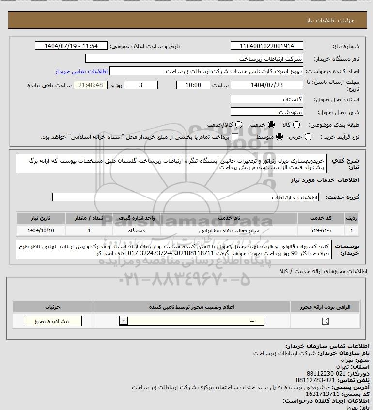 شرح کلی نیاز: خریدوبهسازی دیزل ژنراتور و تجهیزات جانبی ایستگاه تنگراه ارتباطات زیرساخت گلستان طبق مشخصات پیوست که ارائه برگ پیشنهاد قیمت الزامیست.عدم پیش پرداخت