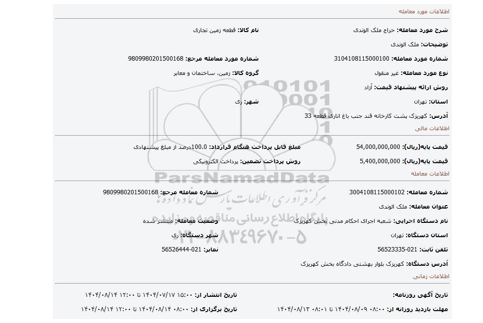 | شماره مورد معامله: 3104108115000100 | شماره مورد معامله مرجع: 9809980201500168 | |