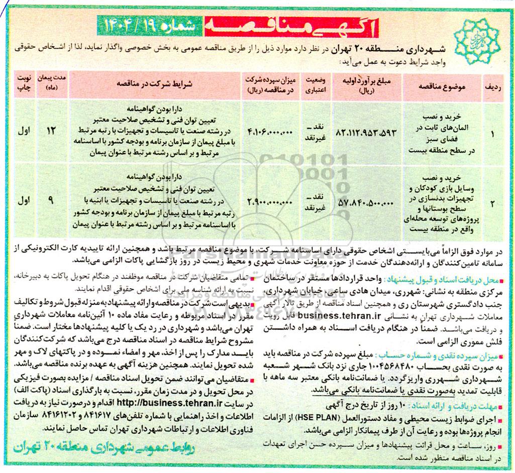 2 خرید و نصب وسایل بازی کودکان و تجهیزات بدنسازی در سطح بوستان ها و پروژه های توسعه محله ای واقع در منطقه بیست 57.840.500.000 نقد - غیر نقد 2.900.000.000