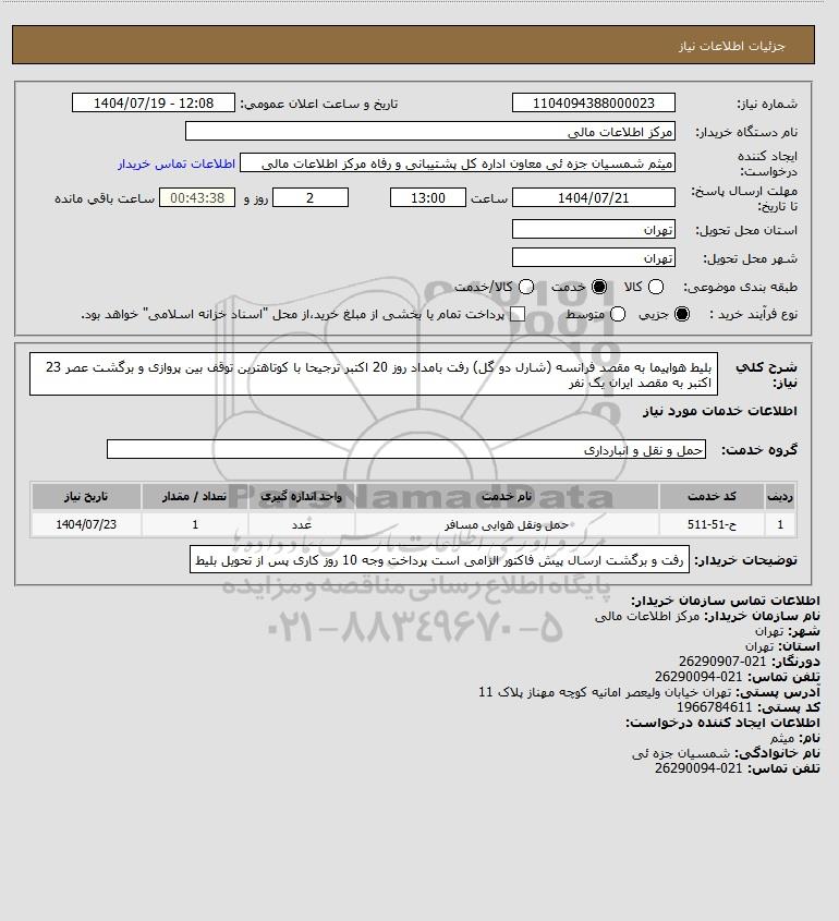 شرح کلی نیاز: بلیط هواپیما به مقصد فرانسه (شارل دو گل) رفت بامداد روز 20 اکتبر ترجیحا با کوتاهترین توقف بین پروازی و برگشت عصر 23 اکتبر به مقصد ایران یک نفر