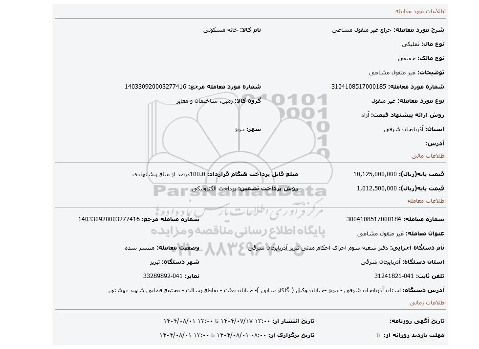 | شماره مورد معامله: 3104108517000185 | شماره مورد معامله مرجع: 140330920003277416 | |