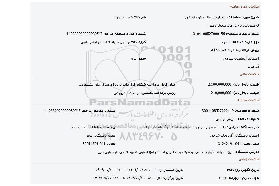 | شماره مورد معامله: 3104108527000156 | شماره مورد معامله مرجع: 140330920000989547 | |