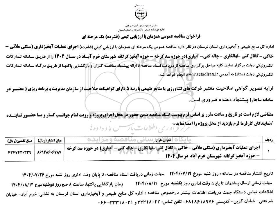 اداره کل منابع طبیعی و آبخیزداری استان لرستان در نظر دارد مناقصه عمومی یک مرحله ای با ارزیابی کیفی (فشرده) اجرای عملیات آبخیزداری (سنگی ملاتی - خاکی - کانال کنی - نهالکاری - چاله کنی - آبیاری) در حوزه سد کرخه - حوزه آبخیز کرکانه شهرستان خرم اباد در سال 1404  را از طریق سامانه تدارکات الکترونیکی دولت برگزار نماید. کلیه مراحل برگزاری مناقصه از دریافت اسناد مناقصه تا ارائه پیشنهاد مناقصه گران و بازگشایی پاکتها از طریق درگاه سامانه تدارکات الکترونیکی دولت (ستاد) ایران انجام خواهد شد.