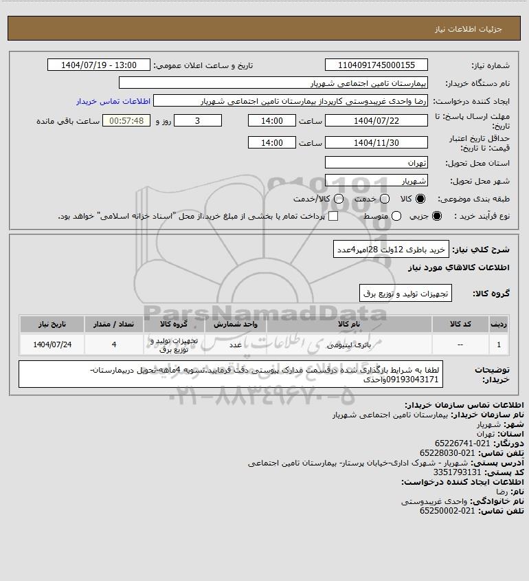 | 1 | -- | باتری لیتیومی | عدد | تجهیزات تولید و توزیع برق | 4 | 1404/07/24 |