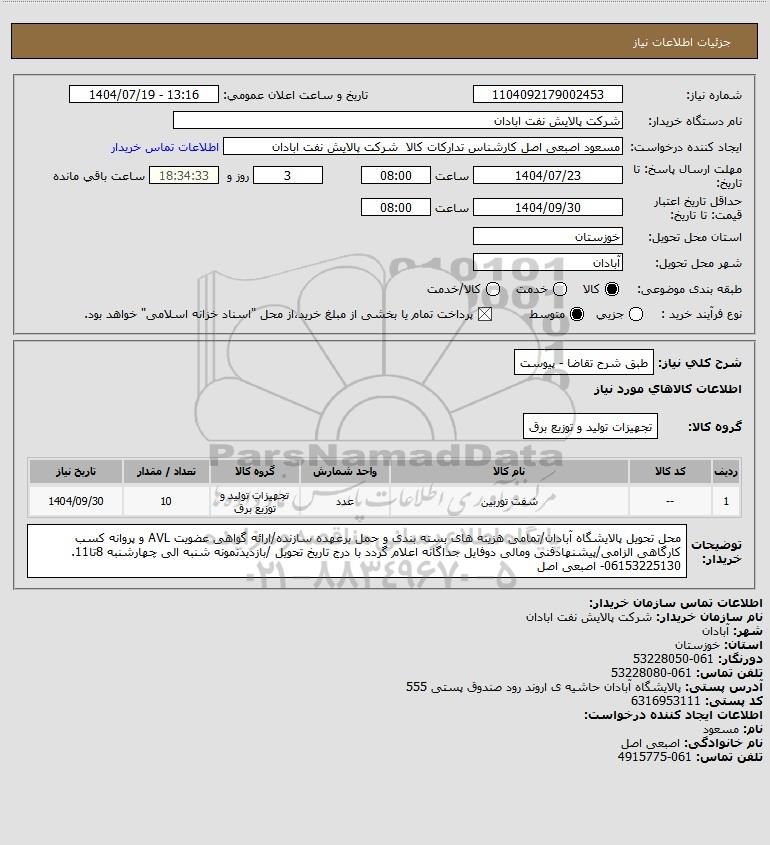 | 1 | -- | شفت توربین | عدد | تجهیزات تولید و توزیع برق | 10 | 1404/09/30 |