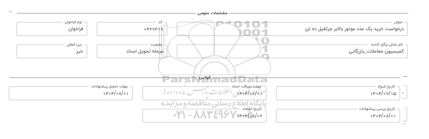 تاریخ شروع: 1404.07.15 - مهلت دریافت اسناد: 1404.08.01. - مهلت تحویل پیشنهادات: 1404.08.01