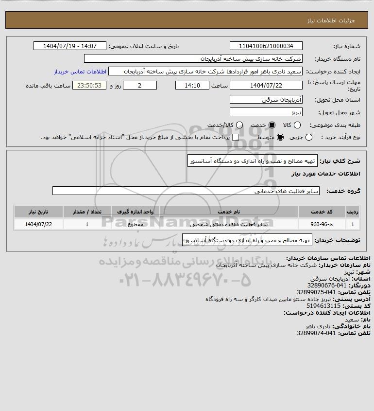 شرح کلی نیاز: تهیه مصالح و نصب و راه اندازی دو دستگاه آسانسور