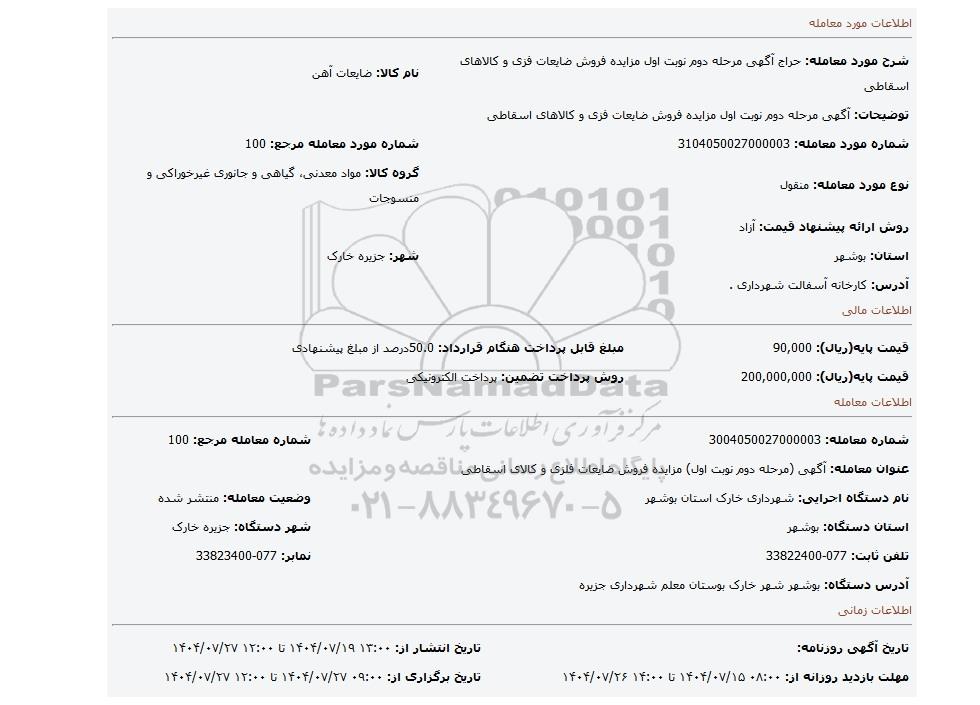 | شرح مورد معامله: حراج آگهی مرحله دوم نوبت اول مزایده فروش ضایعات فزی و کالاهای اسقاطی | نام کالا: ضایعات آهن | |