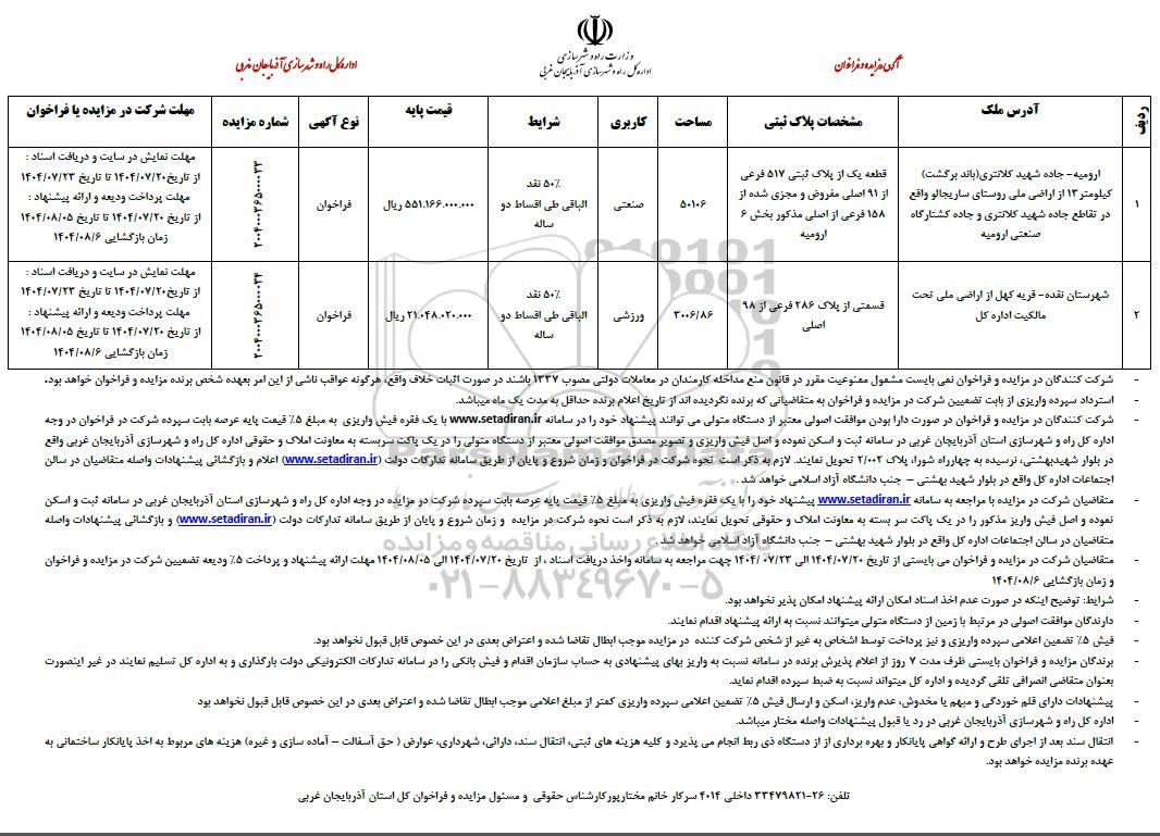 | ارومیه - جاده شهید کلانتری باند برگشت کیلومتر 13 از اراضی ملی روستای ساریجالو واقع در تقاطع جاده شهید کلانتری و جاده کشتارگاه صنعتی ارومیه | قطعه یک از پلاک ثبتی 517 فرعی از 91 اصلی مفروض و مجزی شده از 158 فرعی از اصلی مذکور بخش 6 ارومیه | 50106 | صنعتی | 50 درصد نقد الباقی طی اقساط دو ساله | 551.166.000.000 | فراخوان | 5004000365000033 | مهلت نمایش در سایت و دریافت اسناد : از تاریخ 1404.07.20 تا تاریخ 1404.07.23 مهلت پرداخت ودیعه و ارائه پیشنهاد : از تاریخ 1404.07.20 تا تاریخ 1402.08.05 زمان بازگشایی 1404.08.6 |