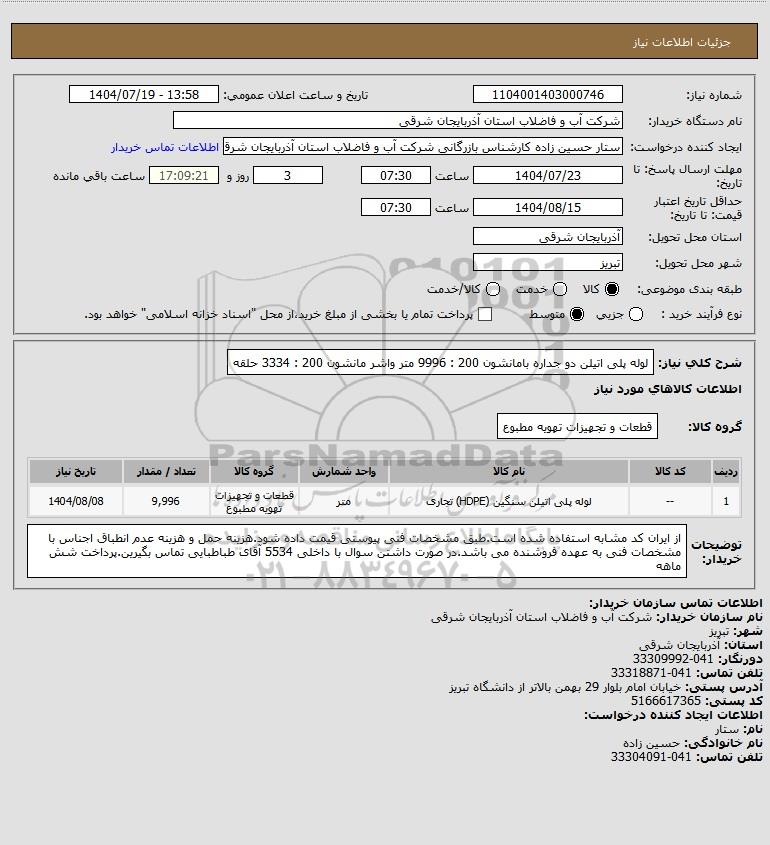 شرح کلی نیاز: لوله پلی اتیلن دو جداره بامانشون 200 : 9996 متر