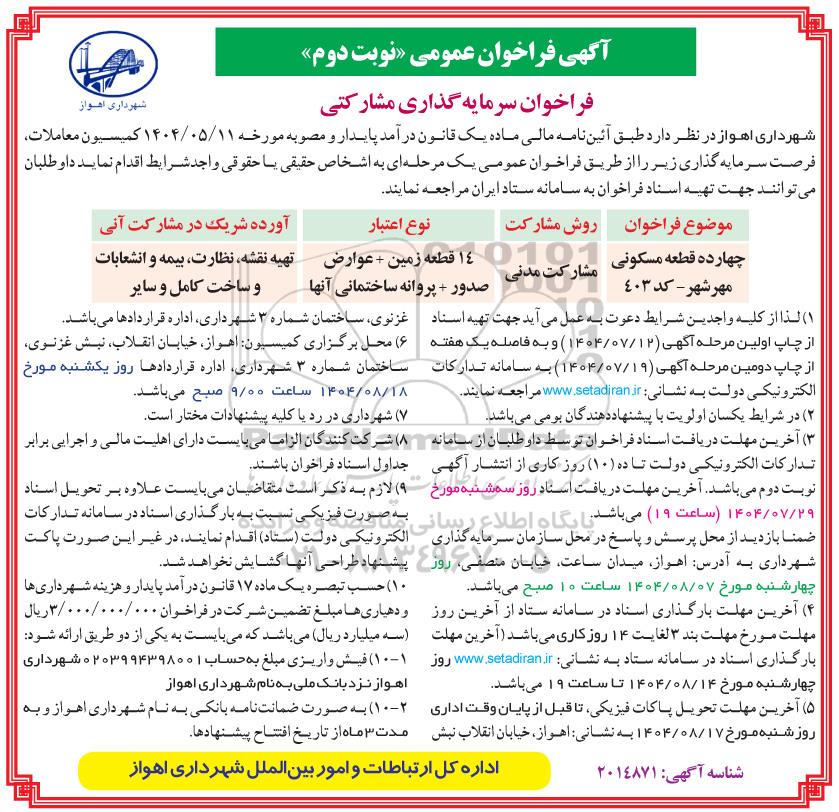 فراخوان سرمایه گذاری مشارکتی ...- نوبت دوم از کلیه افراد متخصص و شرکتها واجد شرایط دعوت به عمل میآید در مناقصه با کد خبرگزاری پارس نماد: 9679167 شرکت نمایند.