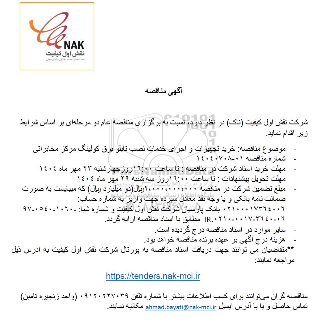 **متقاضیان می توانند جهت دریافت اسناد مناقصه به پورتال شرکت نقش اول کیفیت به آدرس ذیل مراجعه نمایند: https://tenders.nak-mci.ir
