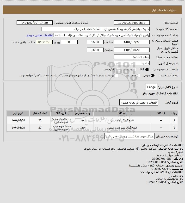 نام دستگاه خریدار:شرکت پالایش گاز شهید هاشمی نژاد استان خراسان رضوی