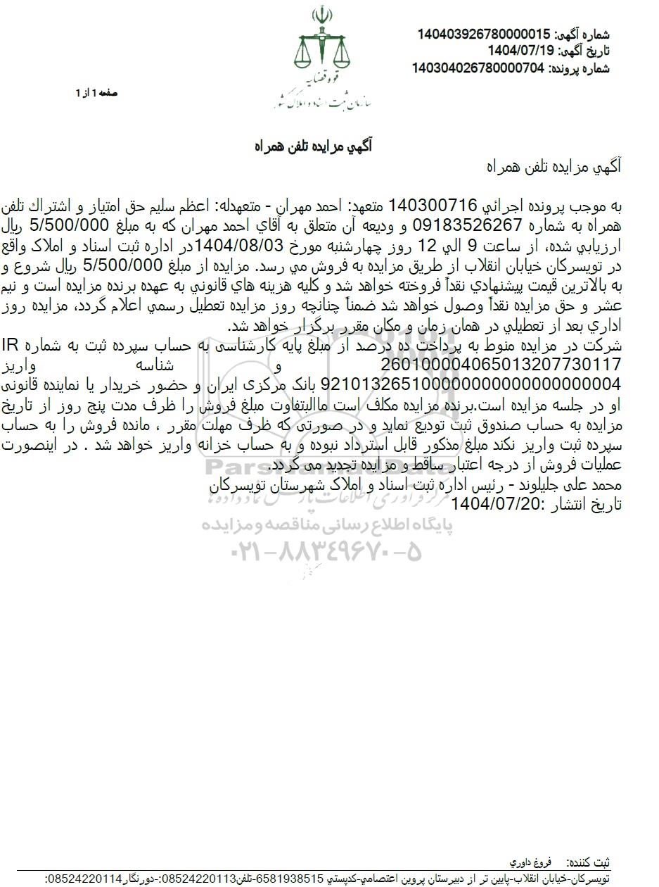 به موجب پرونده اجرائی 140300716 متعهد احمد مهران - متعهدله اعظم سلیم حق امتیاز و اشتراک تلفن همراه به شماره 09183526267 و ودیعه آن متعلق به آقای احمد مهران که به مبلغ 5.500.000 ریال ارزیابی شده از ساعت 9 الی 12 روز چهارشنبه مورخ 1404.08.03 در اداره ثبت اسناد و املاک واقع در تویسرکان خیابان انقلاب از طریق مزایده به فروش میرسد مزایده از مبلغ 5.500.000 ریال شروع و به بالاترین قیمت پیشنهادی نقداً فروخته خواهد شد و کلیه هزینه های قانونی به عهده برنده مزایده است و نیم عشر و حق مزایده نقداً وصول خواهد شد ضمنا چنانچه روز مزایده تعطیل رسمی اعلام گردد مزایده روز اداری بعد از تعطیلی در همان زمان و مکان مقرر برگزار خواهد شد.
