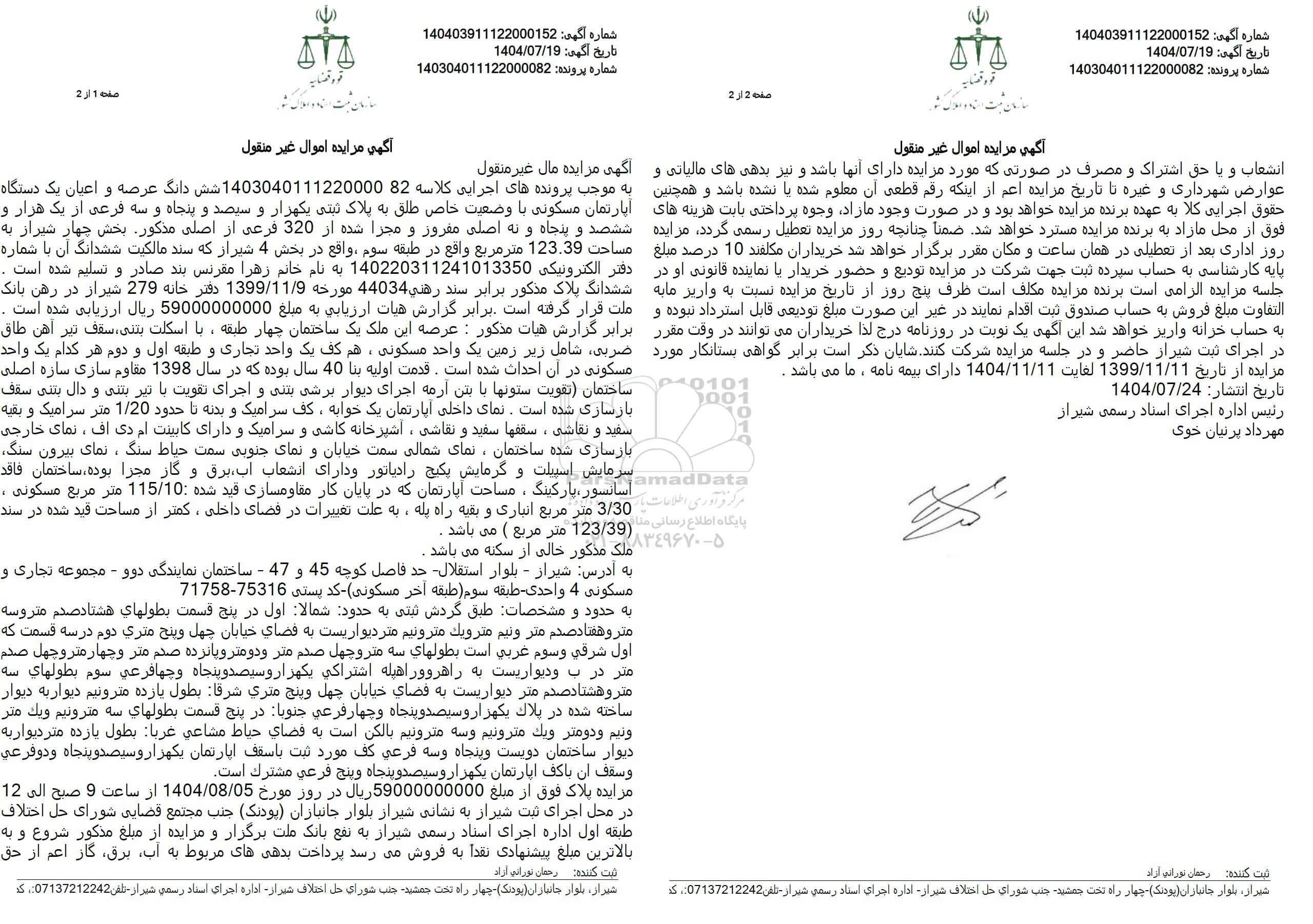 به موجب پرونده های اجرایی کلاسه 82 1403040111220000 شش دانگ عرصه و اعیان یک دستگاه آپارتمان مسکونی با وضعیت خاص طلق به پلاک ثبتی یکهزار و سیصد و پنجاه و سه فرعی از یک هزار و ششصد و پنجاه و نه اصلی مغرور و مجزا شده از 320 فرعی از اصلی مذکور بخش چهار شیراز به مساحت 123.39 متر مربع واقع در طبقه سوم، واقع در بخش 4 شیراز که سند مالکیت ششدانگ آن با شماره دفتر الكترونیكی 140220311241013350 به نام خانم زهرا مقرنس بند صادر و تسلیم شده است . ششدانگ پلاک مذکور برابر سند رهنی 44034 مورخه 1399.11.9 دفتر خانه 279 شیراز در رهن بانک ملت قرار گرفته است. برابر گزارش هیات ارزیابی به مبلغ 59000000000 ریال ارزیابی شده است . برابر گزارش هیات مذکور : عرصه این ملک یک ساختمان چهار طبقه، با اسکلت بتنی ، سقف تیر آهن طاق ضربی شامل زیر زمین یک واحد مسکونی، هم کف یک واحد تجاری و طبقه اول و دوم هر کدام یک واحد مسکونی در آن احداث شده است. قدمت اولیه بنا 40 سال بوده که در سال 1398 مقاوم سازی سازه اصلی ساختمان تقویت ستونها با بتن آرمه اجرای دیوار برشی بتنی و اجرای تقویت با تیر بتنی و دال بتنی سقف بازسازی شده است. نمای داخلی آپارتمان یک خوابه کف سرامیک و بدنه تا حدود 1.20 متر سرامیک و بقیه سفید و نقاشی، سقفها سفید و نقاشی آشپزخانه کاشی و سرامیک و دارای کابینت ام دی اف ، نمای خارجی بازسازی شده ساختمان، نمای شمالی سمت خیابان و نمای جنوبی سمت حیاط سنگ ، نمای بیرون سنگ سرمایش اسپیلت و گرمایش پکیج رادیاتور و دارای انشعاب آب برق و گاز مجزا بوده ساختمان فاقد آسانسور پارکینگ، مساحت آپارتمان که در پایان کار مقاومسازی قید شده : 115.10 متر مربع مسکونی . 3.30 متر مربع انباری و بقیه راه پله، به علت تغییرات در فضای داخلی، کمتر از مساحت قید شده در سند (123.39 متر مربع ) می باشد .