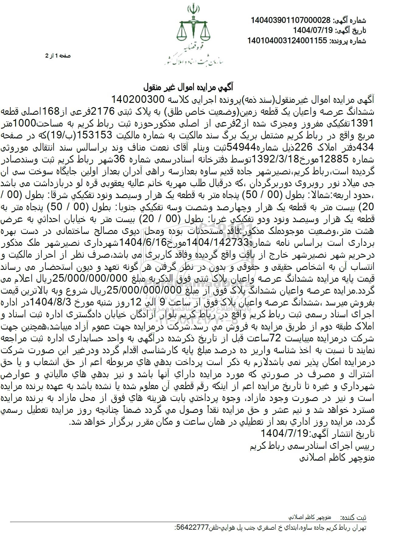 ششدانگ عرصه و اعیان یک قطعه زمین وضعیت خاص (طلق) به پلاک ثبتی 2176 فرعی از 168 اصلی قطعه 1391 تفكیكی مفروز و مجری شده از 2 فرعی از اصلی مذکور حوزه ثبت رباط کریم به مساحت 1000 متر مربع واقع در رباط کریم مشتمل بر یک برگ سند مالکیت به شماره مالکیت 153153 ( ب .19) که در صفحه 434 دفتر املاک 226 ذیل شماره 54944 ثبت و بنام آقای نعمت مناف وند براسالس سند انتقالی موروثی شماره 12885 مورخ 1392.3.18 توسط دفترخانه اسناد رسمی شماره 36 شهر رباط کریم ثبت و سند صادر گردیده است رباط کریم نصیر شهر جاده قدیم ساوه بعد از سه راهی آدران بعد از اولین جایگاه سوخت سی آن جی میلاد نور روبروی دوربرگردان که در قبال طلب مهریه خانم عالیه یعقوبی قره لو در بازداشت می باشد حدود اربعه شمالا : بطول (00 . 50) پنجاه متر به قطعه یک هزار و سیصد و نود تفكیكی شرقا بطول 00 .(20) بیست متر به قطعه یک هزار و چهارصد و شصت و سه تفكیكی جنوبا : بطول 00 . 50) پنجاه متر به قطعه یک هزار و سیصد و نود و دو تفكیكی غربا بطول (00 . 20 بیست متر به خیابان احداثی به عرض هشت متر وضعیت موجود ملک مذکور فاقد مستحدثات بوده و محل دپوی مصالح ساختمانی در دست بهره برداری است بر اساس نامه شماره 1404.142733 مورخ 1404.6.16 شهرداری نصیر شهر ملک مذکور در حریم شهر نصیر شهر خارج از بافت واقع گردیده و فاقد کاربری می باشد صرف نظر از احراز مالکیت و انتساب آن به اشخاص حقیقی و حقوقی و بدون در نظر گرفتن هر گونه تعهد و دیون استحضار می رساند قیمت پایه مزایده ششدانگ عرصه و اعیان پلاک ثبتی فوق الذکر به مبلغ 25.000.000.000 ریال اعلام می گردد. مزایده عرصه و اعیان ششدانگ پلاک فوق از مبلغ 25.000.000.000 ریال شروع و به بالاترین قیمت بفروش میرسد ، ششدانگ عرصه و اعیان پلاک فوق از ساعت 9 الی 12 روز شنبه مورخ 1404.8.3 در اداره اجرای اسناد رسمی ثبت رباط کریم واقع در رباط کریم بلوار آزادگان خیابان دادگستری اداره ثبت اسناد و املاک طبقه دوم از طریق مزایده به فروش میرسد. شرکت در مزایده جهت عموم آزاد میباشد، همچنین جهت شرکت در مزایده میبایست 72 ساعت قبل از تاریخ ذکر شده در آگهی به واحد حسابداری اداره ثبت مراجعه نمایند تا نسبت به اخذ شناسه واریز ده درصد مبلغ پایه کارشناسی اقدام گردد و در غیر این صورت شرکت در مزایده امکان پذیر نمی باشد لازم به ذکر است پرداخت بدهی های مربوطه اعم از حق انشعاب و یا حق اشتراك و مصرف در صورتی که مورد مزایده دارای آنها باشد و نیز بدهی های مالیاتی و عوارض شهرداری و غیره تا تاریخ مزایده اعم از اینکه رقم قطعی آن معلوم شده یا نشده باشد به عهده برنده مزایده است و نیز در صورت وجود مازاد وجوه پرداختی بابت هزینه های فوق از محل مازاد به برنده مزایده مسترد خواهد شد و نیم عشر و حق مزایده نقداً وصول میگردد ضمنا چنانچه روز مزایده تعطیل رسمی گردد مزایده روز اداری بعد از تعطیلی در همان ساعت و مکان مقرر برگزار خواهد شد.