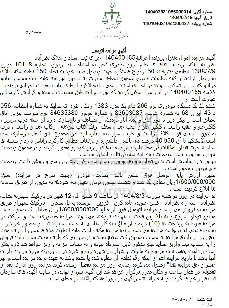 مزایده ششدانگ یک دستگاه خودروی پژو 206 هاچ بک, مزایده ششدانگ یک دستگاه خودروی پژو 206 هاچ بک