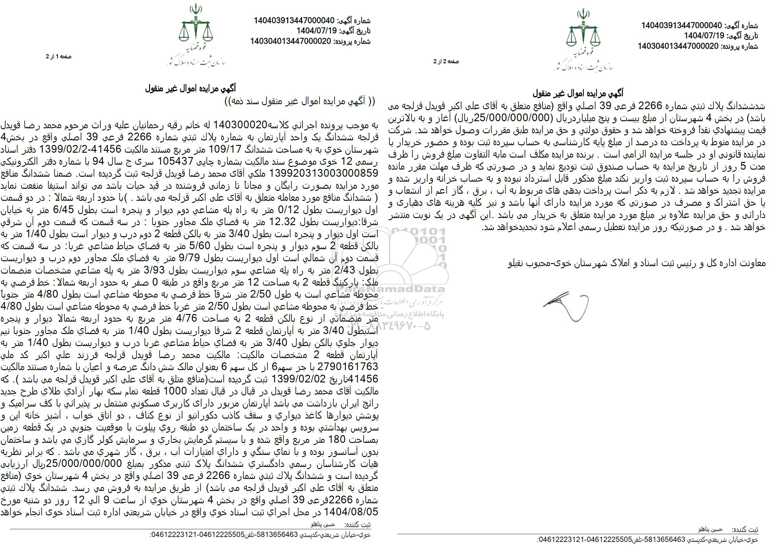 ششدانگ پلاک ثبتی شماره 2266 فرعی 39 اصلی واقع منافع متعلق به آقای علی اکبر قویدل قزلجه می باشد در بخش 4 شهرستان از مبلغ بیست و پنج میلیاردریال 25.000.000.000 ریال آغاز و به بالاترین قیمت پیشنهادی نقداً فروخته خواهد شد و حقوق دولتی و حق مزایده طبق مقررات وصول خواهد شد. شرکت در مزایده منوط به پرداخت ده درصد از مبلغ پایه کارشناسی به حساب سپرده ثبت بوده و حضور خریدار یا نماینده قانونی او در جلسه مزایده الزامی است. برنده مزایده مکلف است ما به التفاوت مبلغ فروش را ظرف مدت 5 روز از تاریخ مزایده به حساب صندوق ثبت تودیع نماید و در صورتی که ظرف مهلت مقرر مانده فروش را به حساب سپرده ثبت واریز نکند مبلغ مذکور قابل استرداد نبوده و به حساب خزانه واریز شده و مزایده تجدید خواهد شد. لازم به ذکر است پرداخت بدهیهای مربوط به آب ، برق ، گاز اعم از انشعاب و یا حق اشتراک و مصرف در صورتی که مورد مزایده دارای آنها باشد و نیز کلیه هزینه های دهیاری و دارائی و حق مزایده علاوه بر مبلغ مورد مزایده متعلق به خریدار میباشد این آگهی در یک نوبت منتشر خواهد شد . و در صورتیکه روز مزایده تعطیل رسمی اعلام شود تجدید خواهد شد.