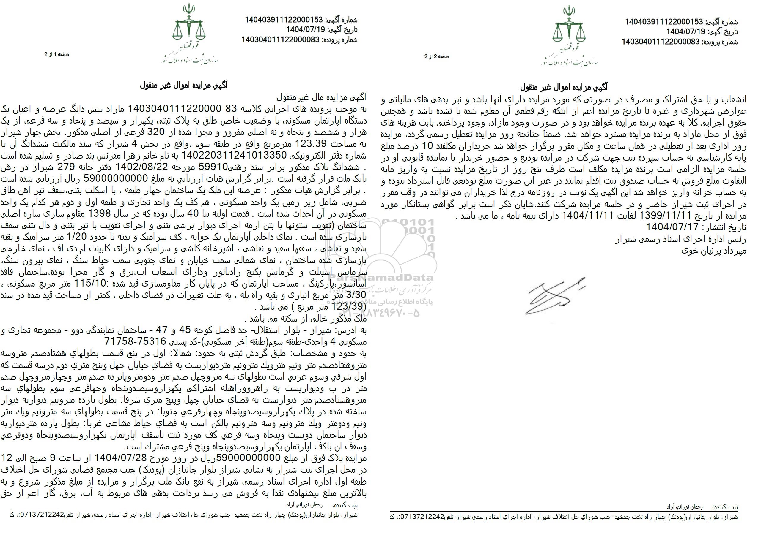 مزایده پلاک فوق از مبلغ 59000000000 ریال در روز مورخ 1404.07.28 از ساعت 9 صبح الی 12 در محل اجرای ثبت شیراز به نشانی شیراز بلوار جانبازان (پودنک) جنب مجتمع قضایی شورای حل اختلاف طبقه اول اداره اجرای اسناد رسمی شیراز به نفع بانک ملت برگزار و مزایده از مبلغ مذکور شروع و به بالاترین مبلغ پیشنهادی نقدا به فروش میرسد پرداخت بدهی های مربوط به آب برق گار اعم از حق انشعاب و یا حق اشتراک و مصرف در صورتی که مورد مزایده دارای آنها باشد و تیز بدهی های مالیاتی و عوارض شهرداری و غیره تا تاریخ مزایده اعم از اینکه رقم قطعی آن معلوم شده یا نشده باشد و همچنین حقوق اجرایی کلا به عهده برنده مزایده خواهد بود و در صورت وجود مازاد وجوه پرداختی بابت هزینه های فوق از محل مازاد به برنده مزایده مسترد خواهد شد. ضمنا چنانچه روز مزایده تعطیل رسمی گردد. مزایده روز اداری بعد از تعطیلی در همان ساعت و مکان مقرر برگزار خواهد شد خریداران مکلفند 10 درصد مبلغ پایه کارشناسی به حساب سپرده ثبت جهت شرکت در مزایده تودیع و حضور خریدار یا نماینده قانونی او در جلسه مرايده الزامی است برنده مزایده مکلف است ظرف پنج روز از تاریخ مزایده نسبت به واریر ما به التفاوت مبلغ فروش به حساب صندوق ثبت اقدام نمایند در غیر این صورت مبلغ تودیعی قابل استرداد نبوده و به حساب خزانه واریز خواهد شد این اگهی یک نوبت در روزنامه درج لذا خریداران میتوانند در وقت مقرر در اجرای ثبت شیراز حاضر و در جلسه مزایده شرکت کنند. شایان ذکر است برابر گواهی بستانکار مورد 1404.07.17 :تاریخ انتشار مزایده از تاریخ 1399.11.11 لغایت 1404.11.11 دارای بیمه نامه ، ما می باشد .