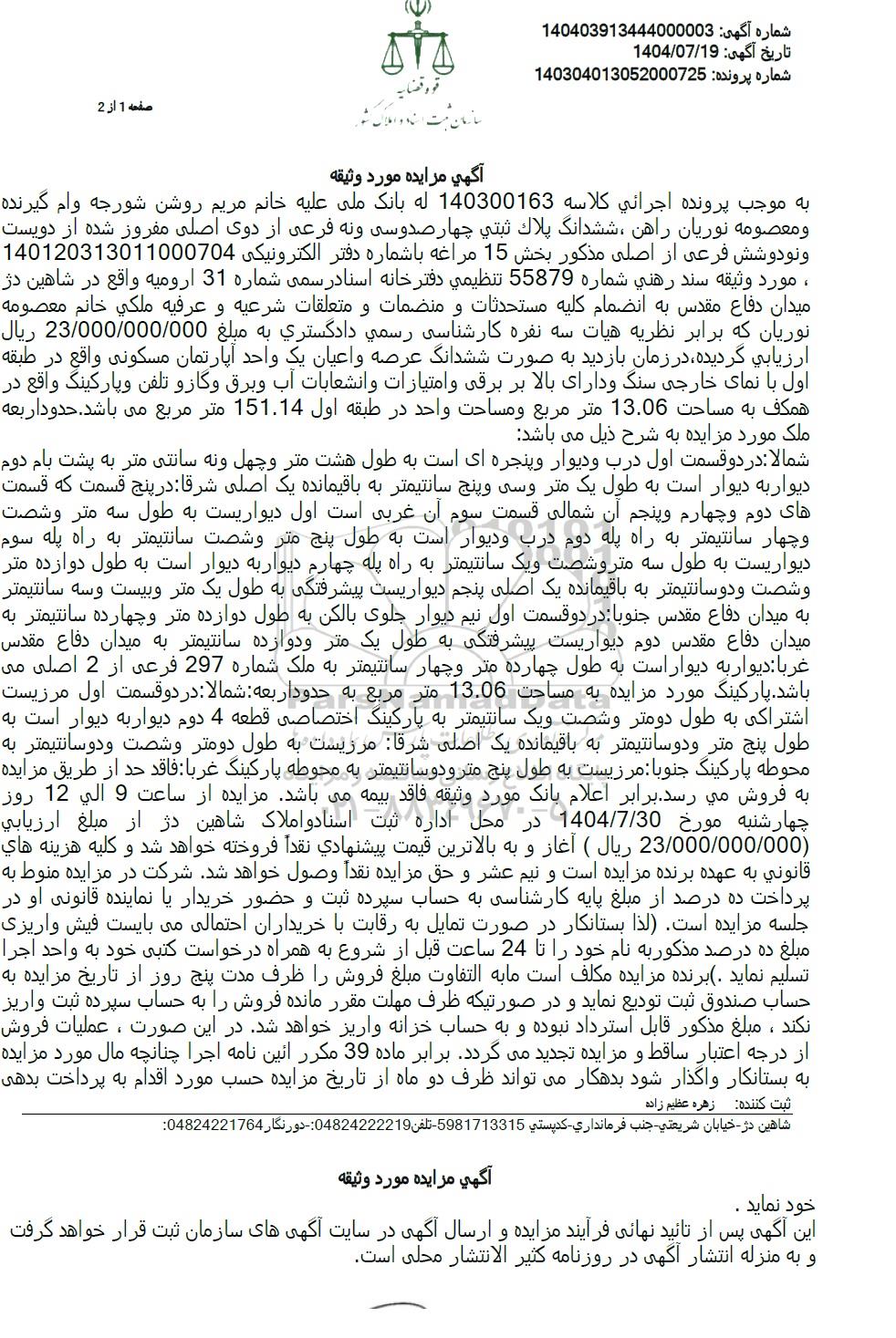 به موجب پرونده اجرانی کلاسه 140300163 له بانک ملی علیه خانم مریم روشن شورجه وام گیرنده و معصومه نوریان راهن ششدانگ پلاک ثبتی چهار صدوسی و نه فرعی از دوی اصلی مفروز شده از دویست و نودوشش فرعی از اصلی مذکور بخش 15 مراغه با شماره دفتر الکترونیکی 140120313011000704 مورد وثیقه سند رهنی شماره 55879 تنظیمی دفترخانه اسنادرسمی شماره 31 ارومیه واقع در شاهین دژ میدان دفاع مقدس به انضمام کلیه مستحدثات و منضمات و متعلقات شرعیه و عرفیه ملکی خانم معصومه نوریان که برابر نظریه هیات سه نفره کارشناسی رسمی دادگستری به مبلغ 23.000.000.000 ریال ارزیابی گردیده در زمان بازدید به صورت ششدانگ عرصه و اعیان یک واحد آپارتمان مسکونی واقع در طبقه اول با نمای خارجی سنگ و دارای بالا بر برقی و امتیازات و انشعابات آب و برق و گاز و تلفن و پارکینگ واقع در همکف به مساحت 13.06 متر مربع و مساحت واحد در طبقه اول 151.14 متر مربع می باشد. حدود اربعه ملک مورد مزایده به شرح ذیل می باشد