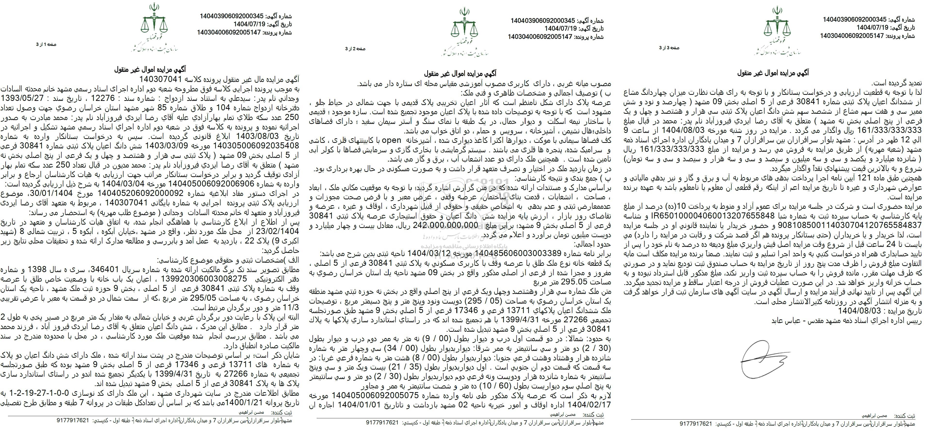 مزایده ششدانگ اعیان پلاک ثبتی شماره 30841 فرعی از 5 اصلی بخش 09 مشهد کلاسه 140307041