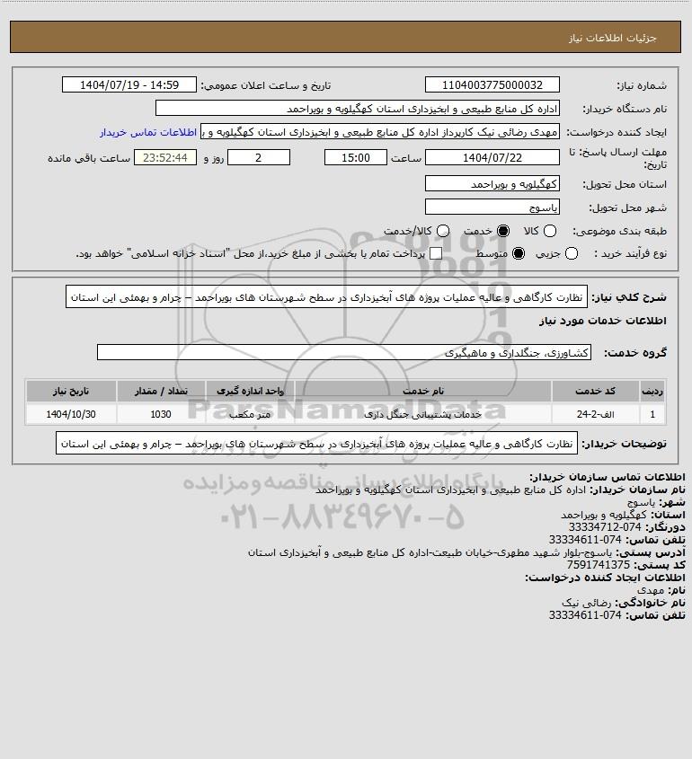 شرح کلی نیاز: نظارت کارگاهی و عالیه عملیات پروژه های آبخیزداری در سطح شهرستان های بویراحمد – چرام و بهمئی این استان