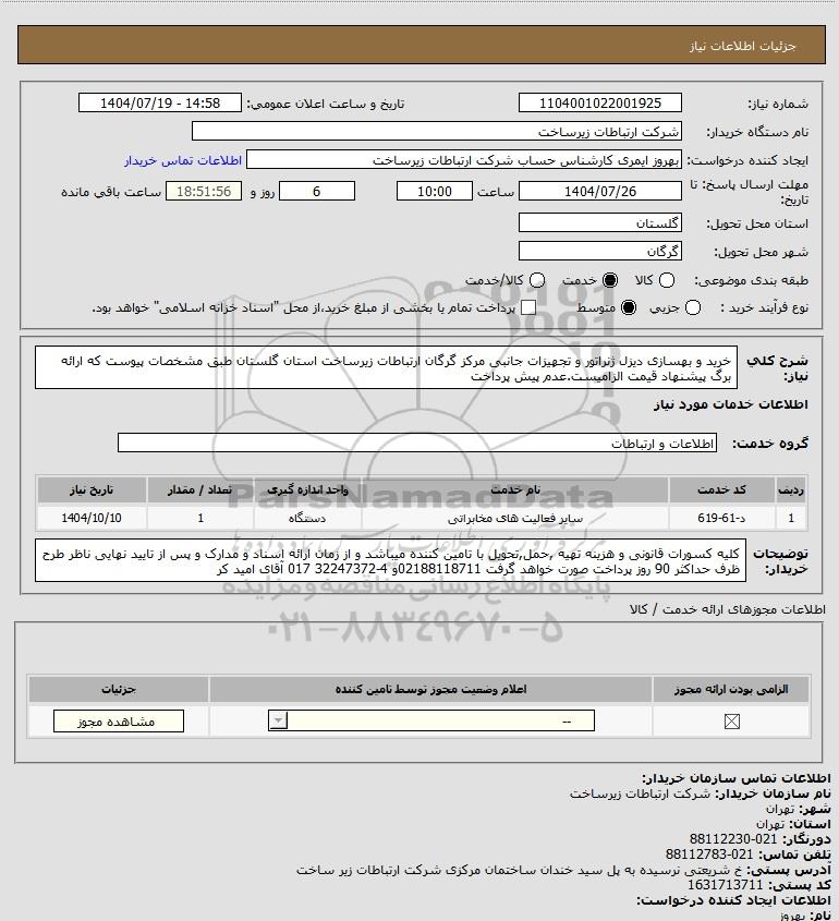 شرح کلی نیاز: خرید و بهسازی دیزل ژنراتور و تجهیزات جانبی مرکز گرگان ارتباطات زیرساخت استان گلستان طبق مشخصات پیوست که ارائه برگ پیشنهاد قیمت الزامیست.عدم پیش پرداخت
