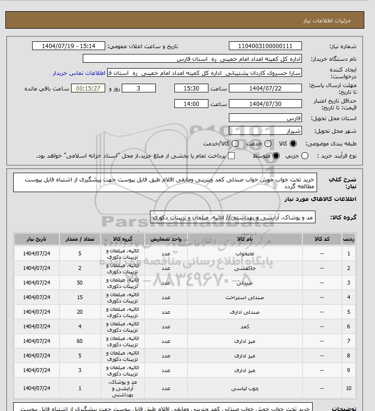 نام دستگاه خریدار:اداره کل کمیته امداد امام خمینی ره استان فارس