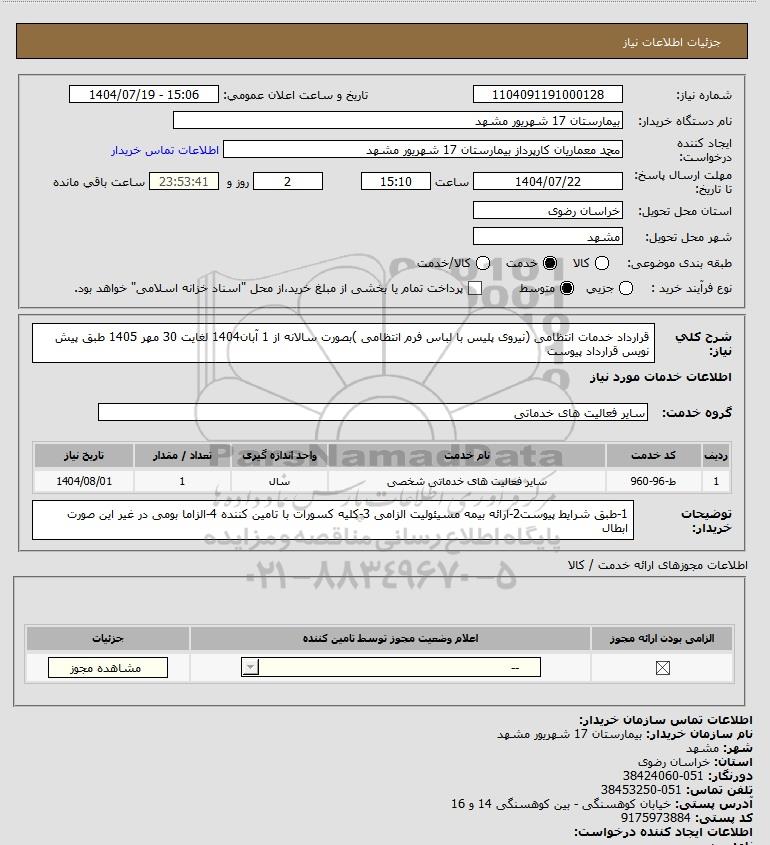 شرح کلی نیاز: قرارداد خدمات انتظامی (نیروی پلیس با لباس فرم انتظامی )بصورت سالانه از 1 آبان1404 لغایت 30 مهر 1405