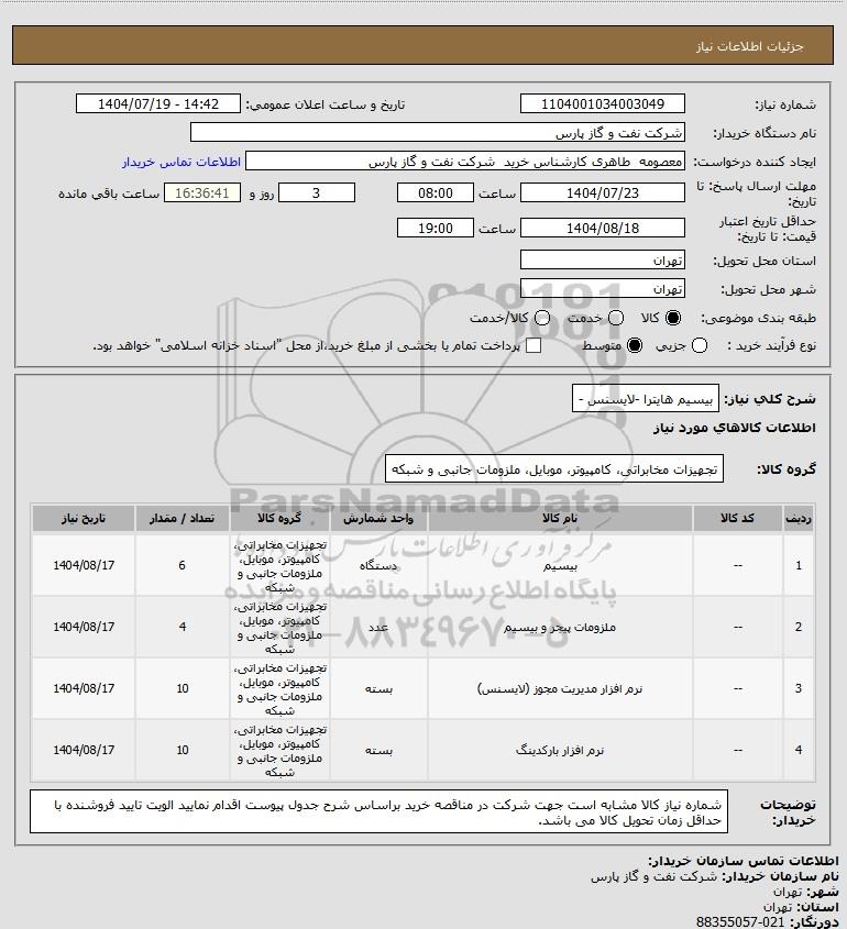 | 3 | -- | نرم افزار مدیریت مجوز (لایسنس) | بسته | تجهیزات مخابراتی، کامپیوتر، موبایل، ملزومات جانبی و شبکه | 10 | 1404/08/17 |