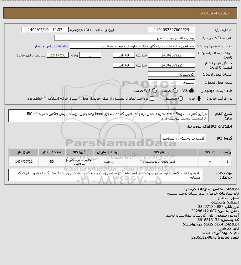 شرح کلی نیاز: میکرو کتتر . تسویه5 ماهه .هزینه حمل برعهده تامین کننده . مجوز imed وهمچنین پیوست پیش فاکتور همراه کد IRC الزامیست.لیست پیوست دارد