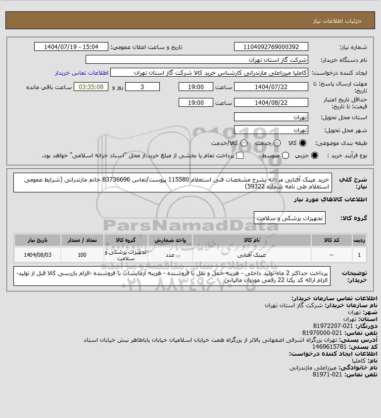 شرح کلی نیاز: خرید عینک آفتابی مردانه بشرح مشخصات فنی استعلام 115580 پیوست/تماس 83736696 خانم مازندرانی (شرایط عمومی استعلام طی نامه شماره 59322)