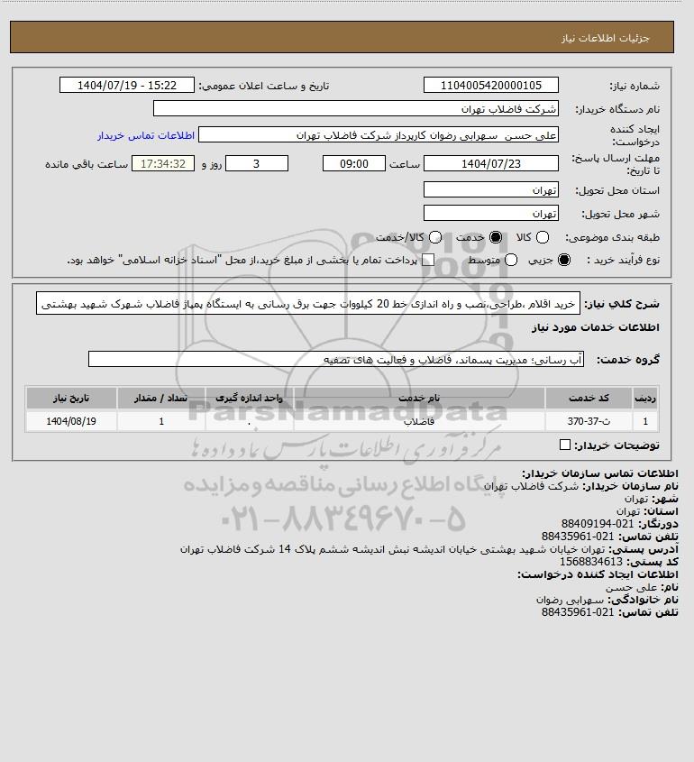 شرح کلی نیاز: خرید اقلام ،طراحی،نصب و راه اندازی خط 20 کیلووات جهت برق رسانی به ایستگاه پمپاژ فاضلاب شهرک شهید بهشتی