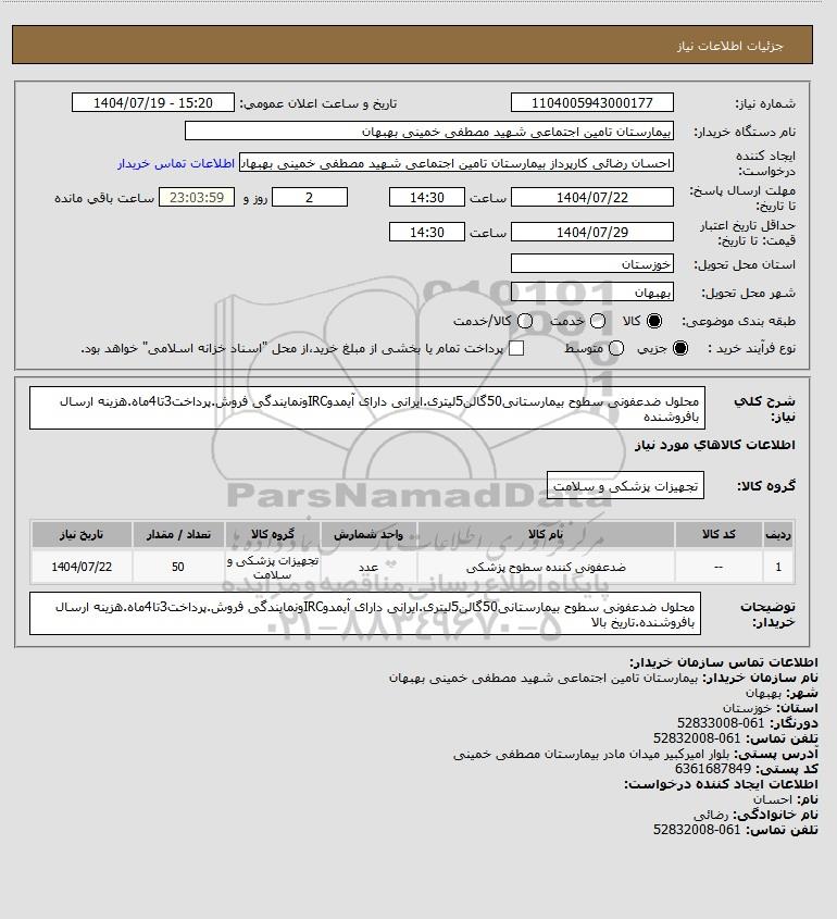 شرح کلی نیاز: محلول ضدعفونی سطوح بیمارستانی50گالن5لیتری.ایرانی دارای آیمدوIRCونمایندگی فروش.پرداخت3تا4ماه.هزینه ارسال بافروشنده
