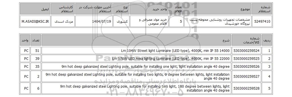 52497410 | مشخصات تجهیزات روشنایی محوطه پست نیروگاه خورشیدی | 5 | خرید مواد مصرفی و اقلام عمومی | کشوری | 1404/07/19 | مزدک اسدی | M.ASADI@KSC.IR |